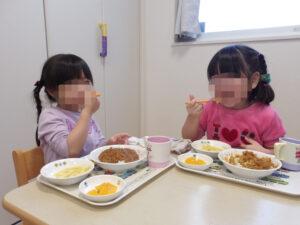 楽しみのひとつ、みんなで給食です!みんな美味しそうに食しています♪